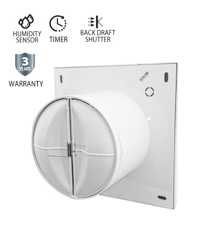 The VENTI-AS bathroom fan is designed to provide intelligent and efficient ventilation for modern bathrooms and utility spaces. Available only in Ø100mm, it combines advanced functionality with a clean, slim design. Equipped with a built-in humidity sensor and timer, the fan automatically activates when moisture levels rise and continues operating for the required time to ensure effective ventilation. The built-in back draft shutter prevents air from flowing back into the room when the fan is not operating, improving comfort and energy efficiency. With low noise operation and long service life, the VENTI-AS offers reliable daily performance. Its slim design allows discreet installation, making it an ideal choice for contemporary interiors.VENTI A100S Fan is a convenient and efficient solution for maintaining excellent ventilation in any home, office, or shop. The model comes in white, allowing it to easily blend with other elements of the room’s décor. Diameter: 100 mm Humidity sensor: included Timer: included Plastic shutter: included Power: 12 W Airflow capacity: 180 m³/h Motor speed: 2650 rpm Noise level: 30 dB